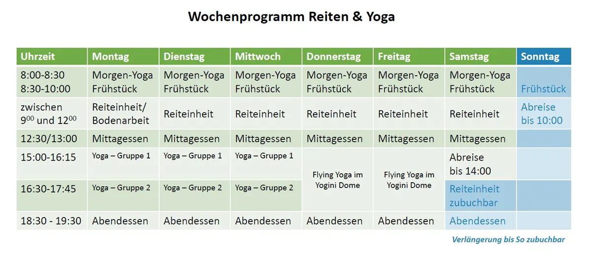 Deine vom Reiten vielleicht ungewohnt beanspruchte Muskulatur erfährt einen entspannenden Ausgleich durch ein achtsam angeleitetes Yogaprogramm. Du startest mit leichten Morgenübungen in den Tag, am Nachmittag folgt eine intensivere Yoga-Einheit.